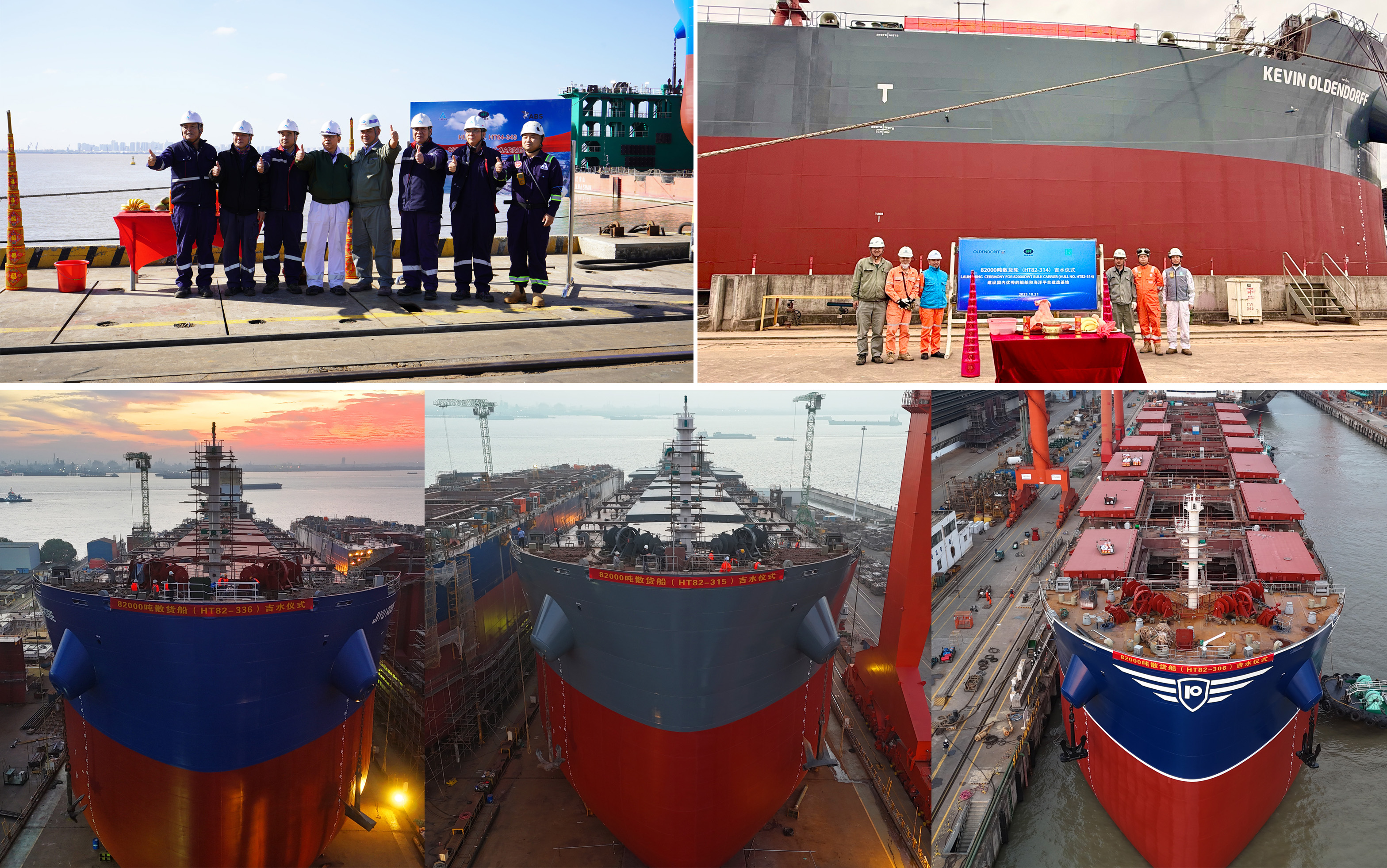 遵循“安全为先”的工作方针,OLDENDORFF项目的HT82-315、HT82-314船舶分别于10月10日、10月21日完成下水任务,为PIONEER建造的HT82-306船舶于10月21日顺利下水,随后10月25日,CIDO项目HT64-343与KCH项目HT82-336接连下水。五艘船舶成功下水,其建造流程项目关键收尾阶段。