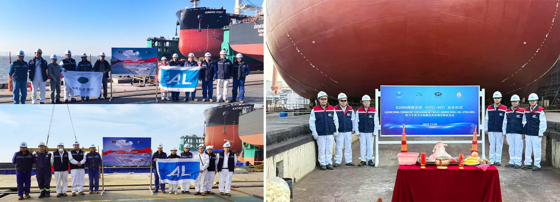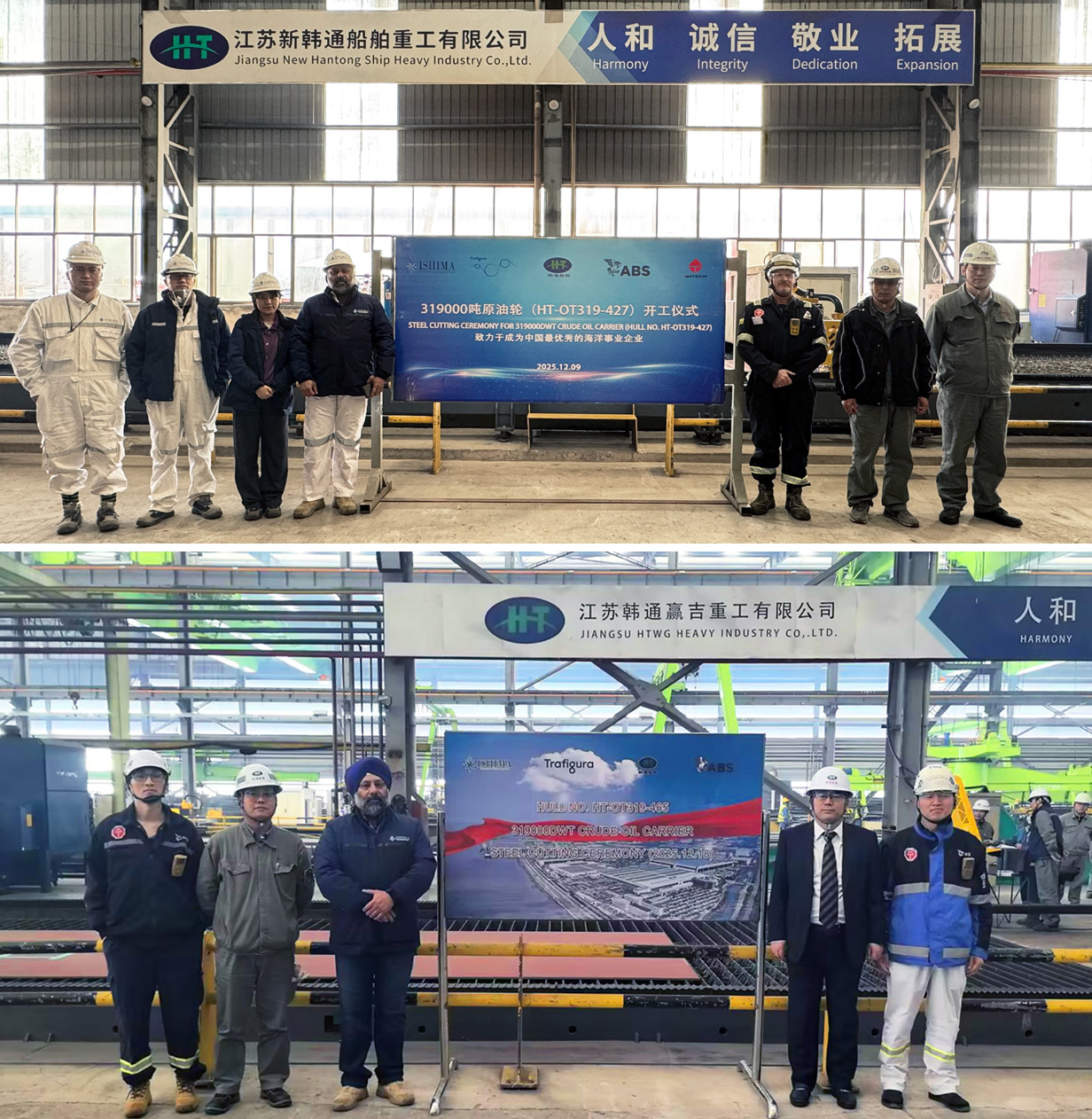 岁末收官,奋斗不止。在集团“保质量、促生产”的核心工作部署指引下,12月在建船舶关键节点稳步推进、高效达成,为全年生产任务的圆满收官奠定了坚实基础,展现了韩通在船舶制造领域卓越的项目统筹与过程管控能力。 开工仪式 开工节点顺利启动,Trafigura的319000吨原油轮HT-OT319-427、HT-OT319-465分别于12月9日、18日正式开工。 重大节点捷报频传 上台节点集中推进,AP的63500吨散货轮HT64-362、HT64-363分别于12月2日、18日完成上台;民生租赁的82000吨散货轮HT82-406于12月8日完成上台;明华的210000吨散货轮HT210-434、HT210-435于12月22日、23日相继完成上台节点;宝源的HT64-393也于12月26日完成上台。 在“安全第一、质量为先”的方针指导下,下水节点圆满完成。AL的63500吨散货船HT64-346、HT64-347分别于12月15日、30日完成下水;民生租赁的82000吨散货轮HT82-405于12月6日顺利下水。 H9辅助平台顺利安装 我司负责承建的三峡大丰800MW风电项目H9辅助平台于12月17日完成海上吊装安装工作,H9升压站辅助平台的安装,对于升压站运行的安全性和运维效率起到较大的提升作用,通过与升压站连接整合H9升压站的运行数据,海况监控、消防系统、设备控制等子系统,实现对升压站运行中关键参数的监测和智能联动控制。 1200T龙门吊提升到位 韩通赢吉1200T-225.6米大吨位大跨度龙门吊,于12.6开始提升,12.24顺利提升到位。 1200T采用单主梁+上下小车结构设计,上小车配备双400吨起升机构,下小车额定起重能力达600吨,设备轨距225.6米,主梁底标高85米,可满足超大型海工装备的高精度吊装需求。 此龙门吊将应用于韩通赢吉新建的30万吨级海工坞,将与另一台1200T龙门吊协同作业,承担坞室的分段吊运与装配任务,为建造2.2万箱超大型集装箱船提供关键支撑。